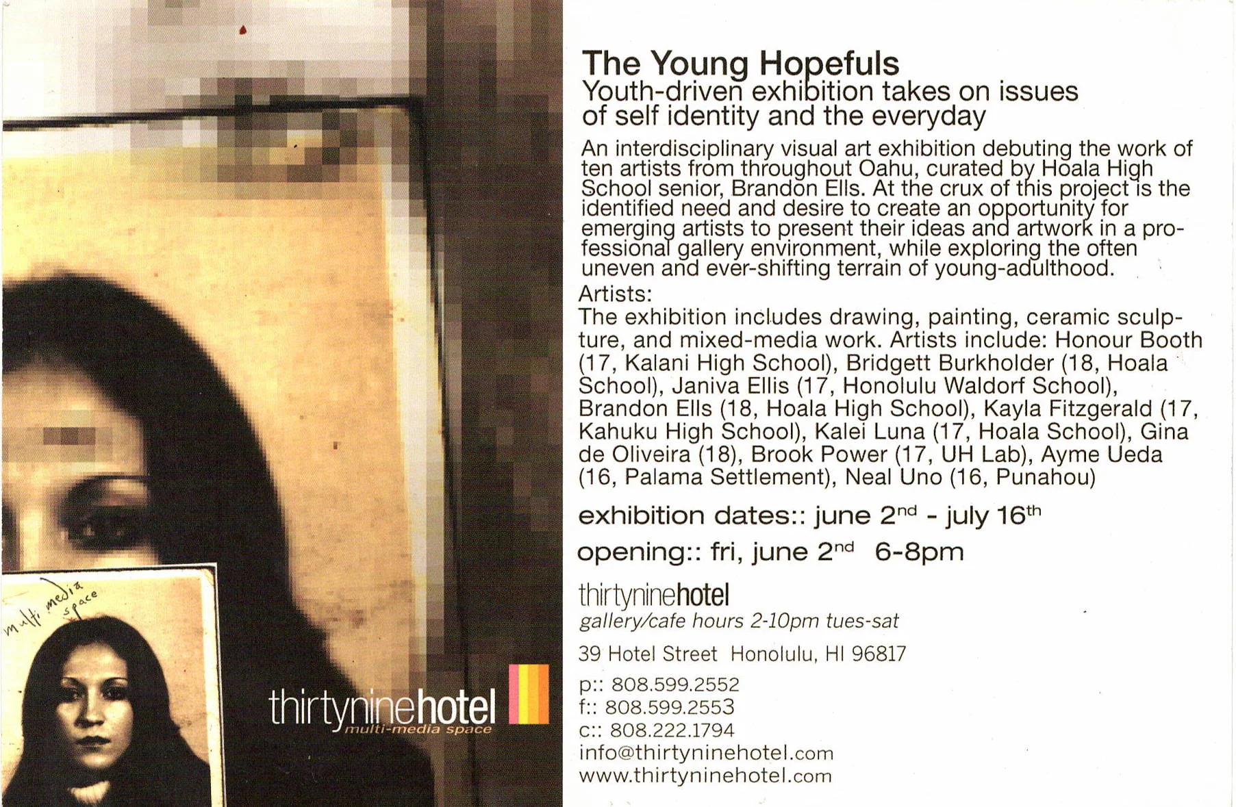 I had never owned a business before. I never ran an art gallery nor did I know how to operate a restaurant or a bar. I just learned as I went. Failure was not an option so I just kept putting one foot in front of the other. Along the way, friends and collaborators popped up at opportune moments and helped steer the ship. One such friend was Trisha Lagaso Goldberg, a fellow SFAI alum who happened to move back to Hawaii after years in the S.F. bay area around the time thirtyninehotel had been open about a year. Our art shows were good but Trisha brought a level of professional curatorial skills to the table that I had not acquired yet. She took over the gallery side of the space and orchestrated a series of art exhibitions that were really quite spectacular not to mention more developed, conceptually. Together, we also collaborated on a program called 39 CARP—thirtynine Chambers Artists Residency Program. We flew internationally recognized artists to Hawaii, paid for their materials, found them assistants, put them up in my house, drove them around, fed them and gave them a bit of cash, and they in turn created amazing, site-specific multi-media installations that took over the entire space and transformed it into a living visual experience. We had a ton of art exhibitions over the course of ten years. Here are the exhibit flyers from some of them.